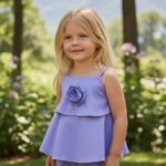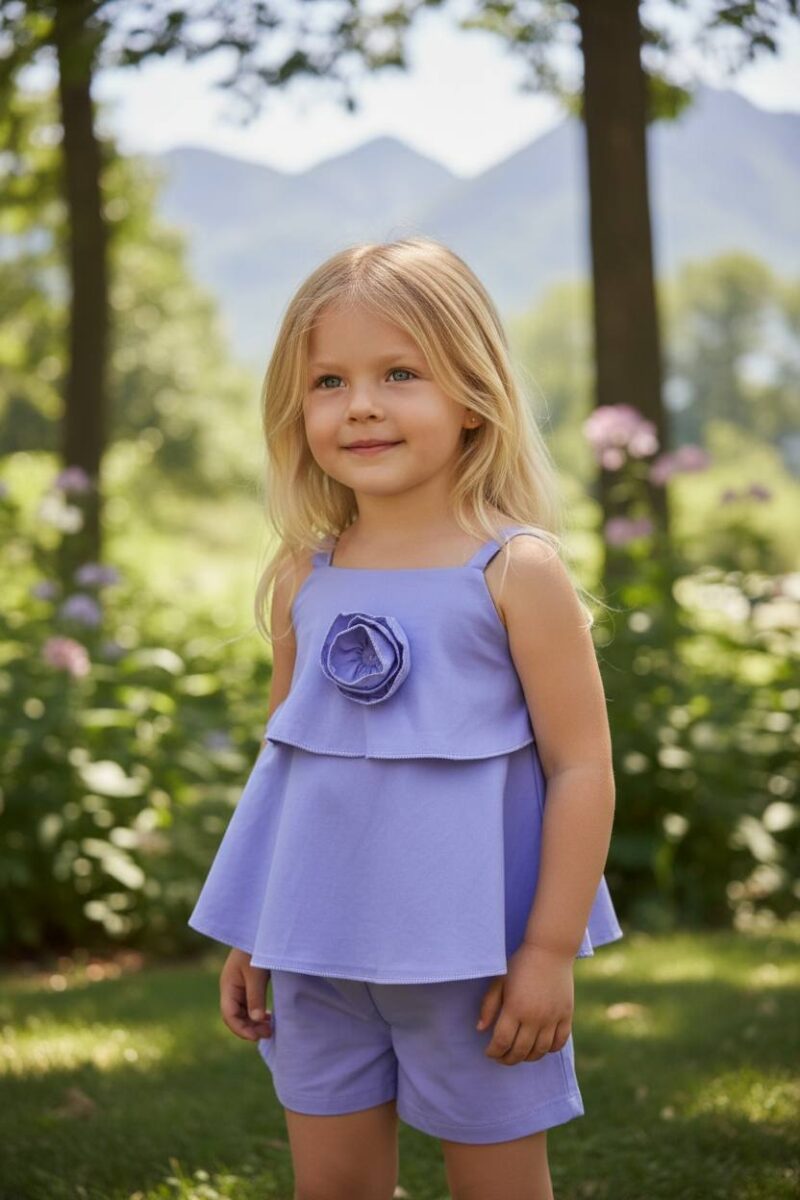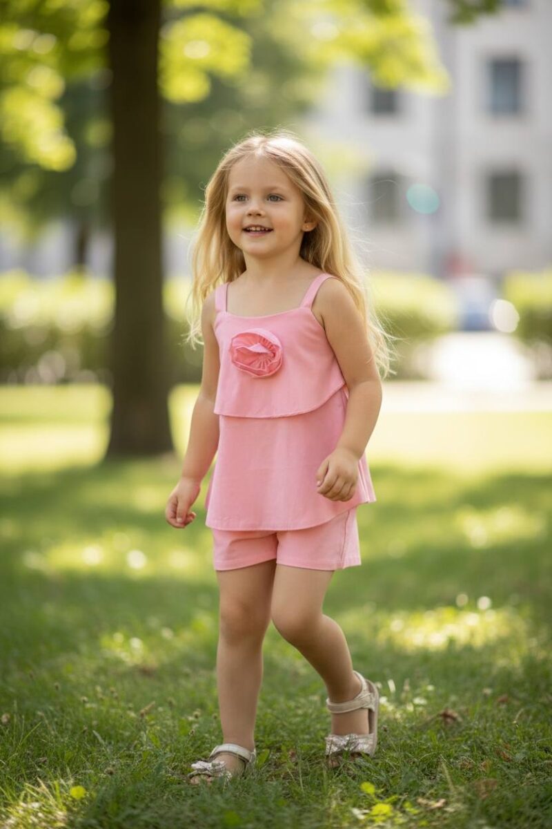 Σετ κοραλλί χρώμα με αεράτο crop top με λουλούδι και σορτς. 100% βάμβακι. Παραγωγή / Κατασκευή Αποκλειστικά στην ΕΛΛΑΔΑ