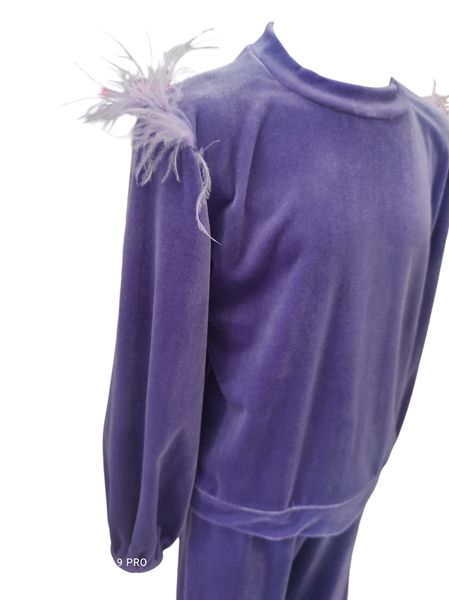 Σετ βελούδο με πούπουλο στους ωμούς και καμπάνα παντελόνι