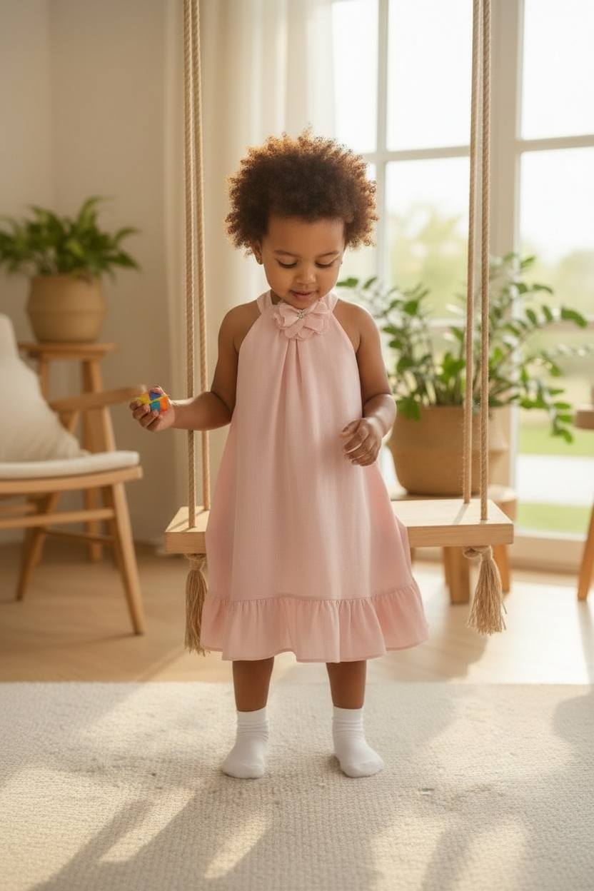 Φόρεμα με λουλούδι- καρφίτσα και βολάν στον ποδόγυρο . Δέσιμο στην πλάτη για μεγαλύτερη ευκολία στην εφαρμογή .Με φόδρα .