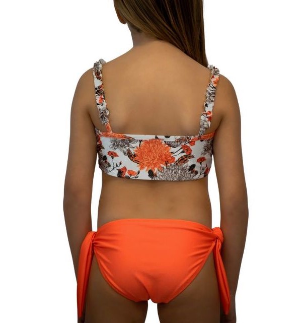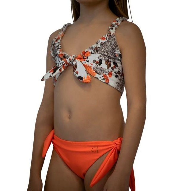Σετ μπικίνι, πορτοκαλί all-over top με δέσιμο στο μπροστινό μέρος και σούρα στην τιράντα, πορτοκαλί μονόχρωμο με δεσίματα στα πλαϊνά bottom. UPF 50+ αντιηλιακή προστασία, τα all-over τυπώματα είναι αποκλειστικότητα της εταιρείας CL.