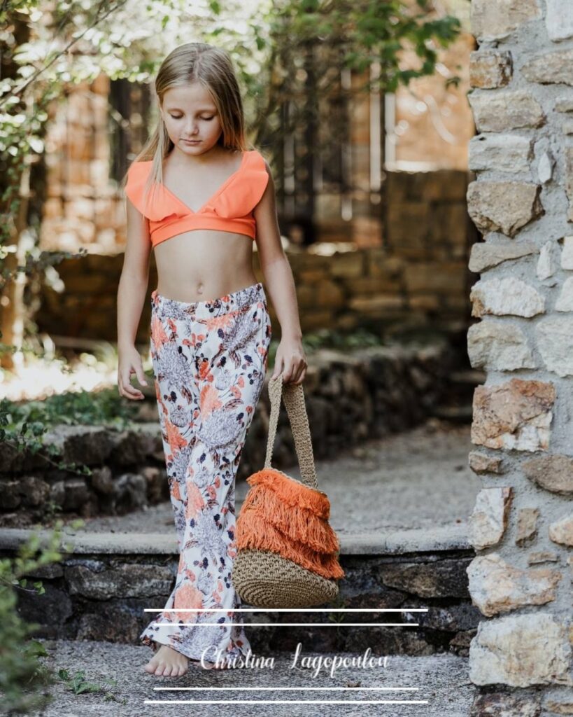 Σετ μπικίνι, πορτοκαλί μονόχρωμο με βολάν top, πορτοκαλί floral all-over με βολάν στα πλαϊνά bottom. UPF 50+ αντιηλιακή προστασία, τα all-over τυπώματα είναι αποκλειστικότητα της εταιρείας CL.
