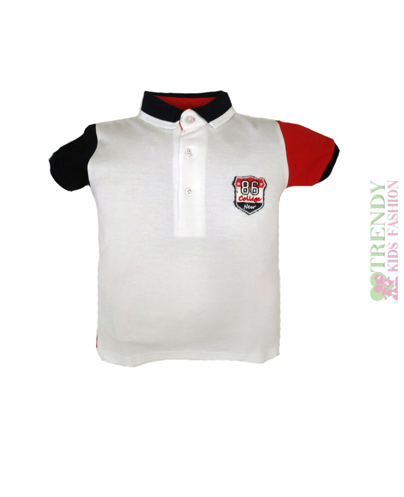 Μπλούζα πόλο, βαμβακερή, ελληνικής κατασκευής, σε λευκό χρώμα με μπλε γιακά και διχρωμα μανίκια σε μπλε και κόκκινο, με τύπωμα