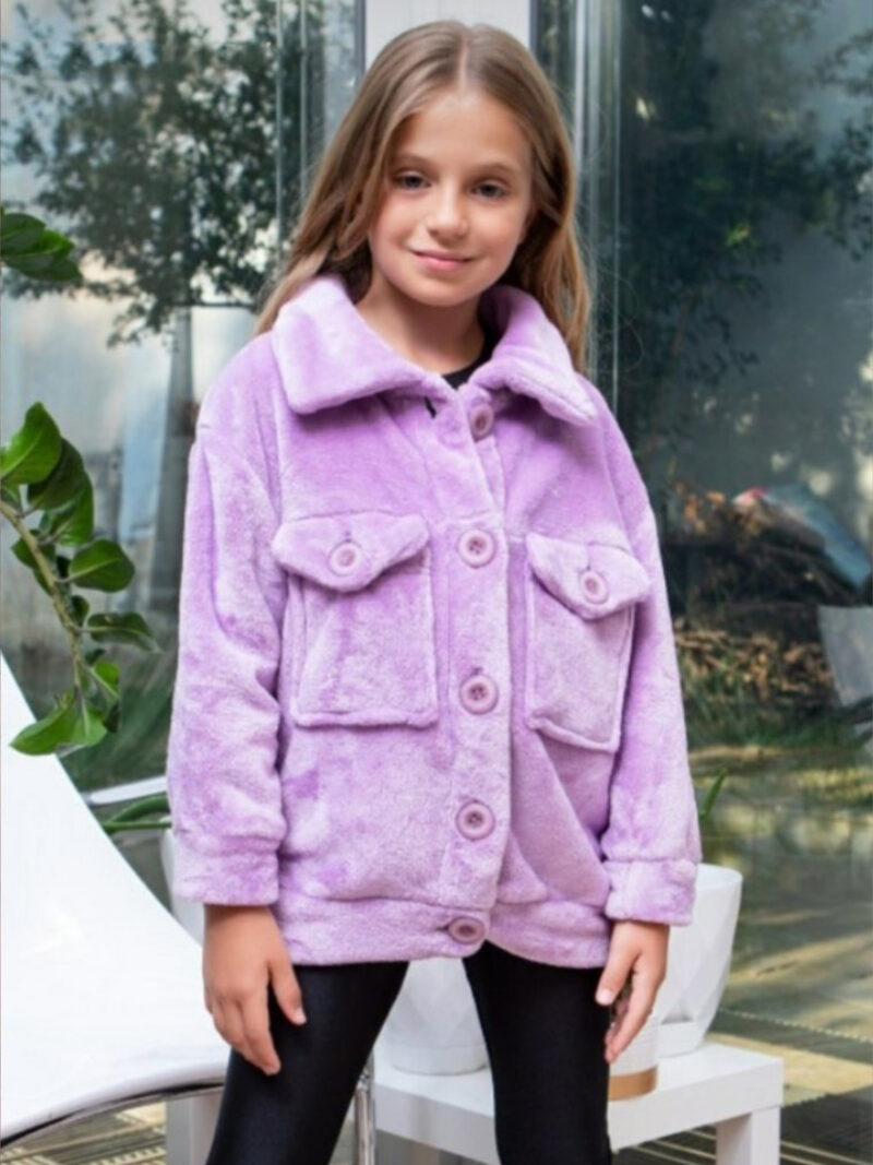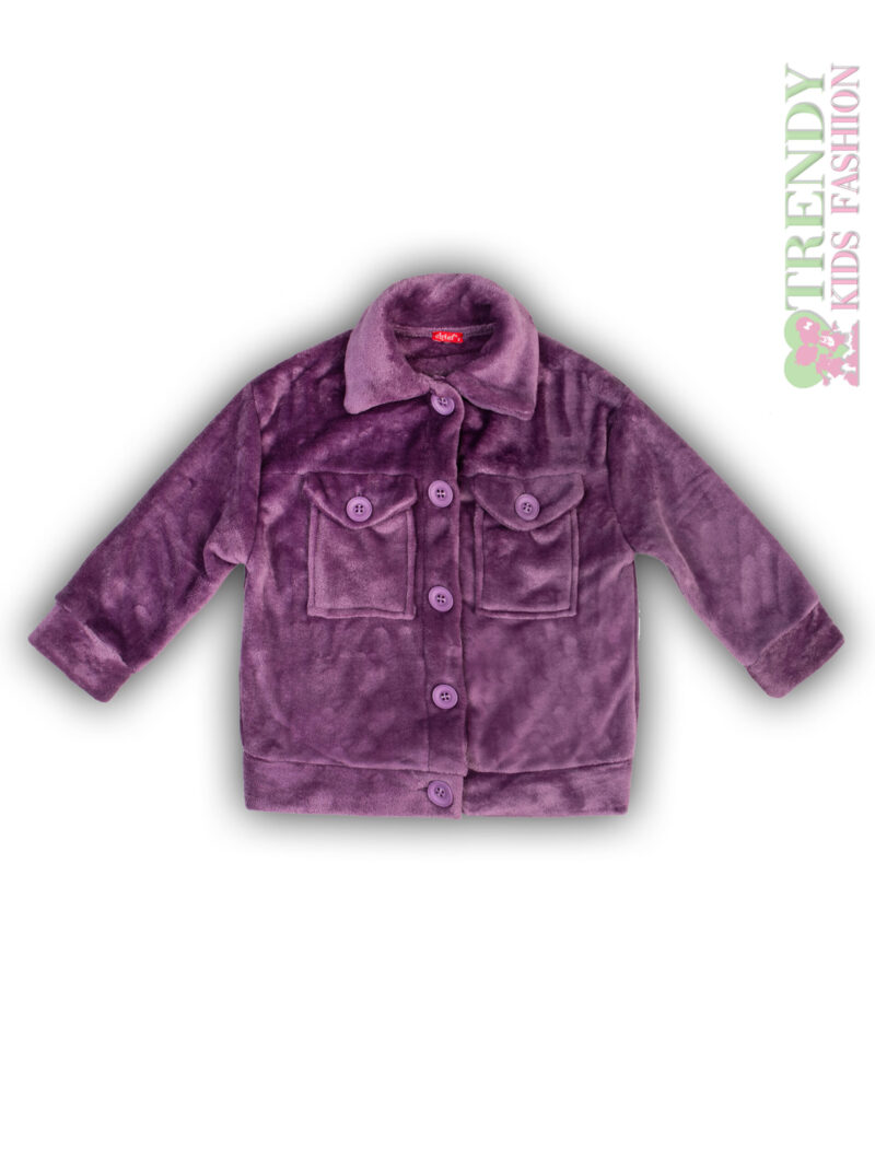 Παιδική χειμερινή ζακέτα fleece για κορίτσι σε μοβ χρώμα με κουμπιά, γιακά και τσέπες σε άνετη γραμμή.