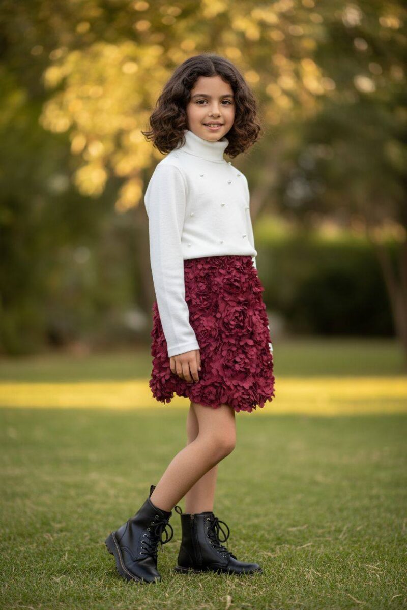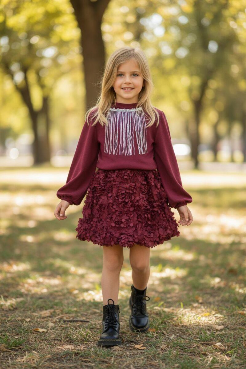 Σετ φούστα με 3D λουλούδια και πλεκτο μπλουζάκι με κρόσσια παγετα