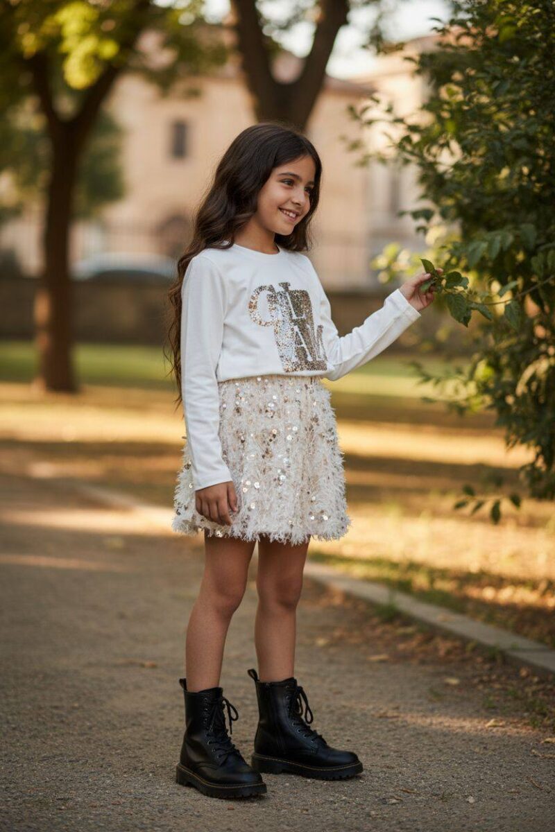 Σετ μπλούζα με παγετες φούστα μπεζ-χρυσού με πούπουλα και παγετα.Παραγωγή / σχεδιασμός αποκλειστικά στην ΕΛΛΑΔΑ .