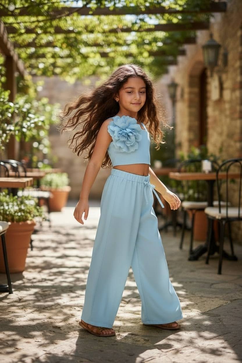 Σετ γαλάζιο σατέν παντελόνι με κροπ-τοπ με καρφίτσα λουλούδι ανοιχτή πλάτη με δέσιμο! Πωλούνται και ξεχώρισα! Παραγωγή / Κατασκευή Αποκλειστικά στην ΕΛΛΑΔΑ