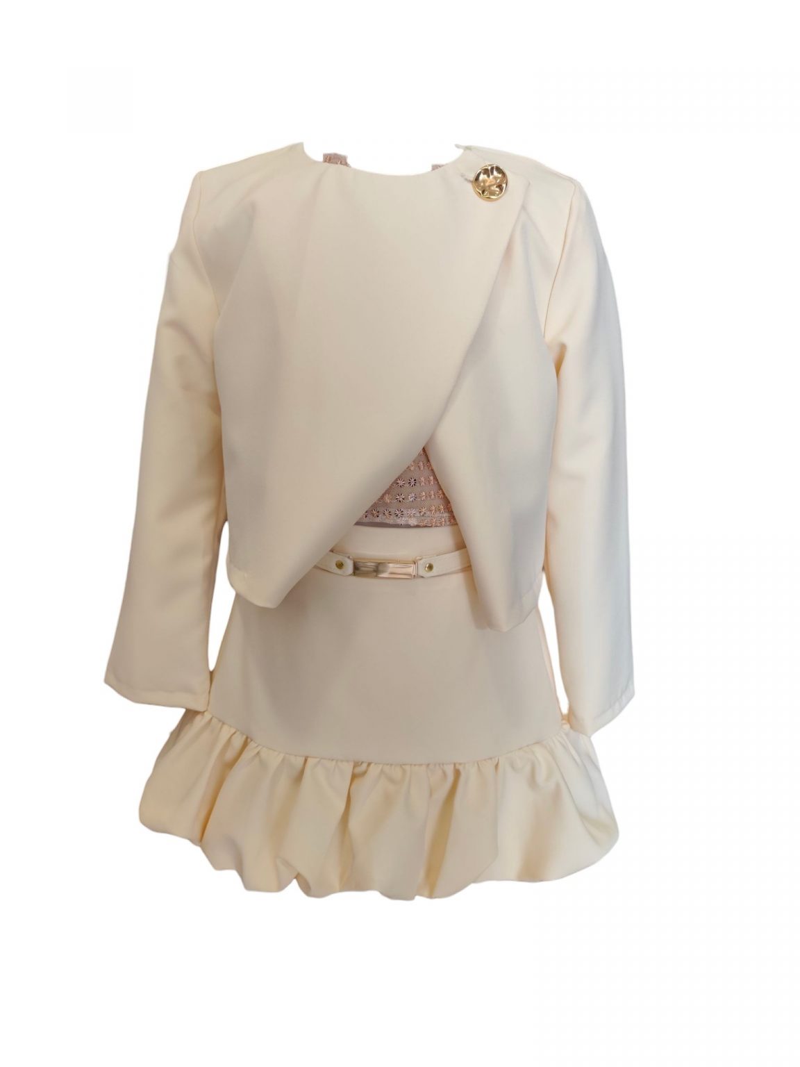 Σακάκι χρυσo κουμπi και φόδρα εσωτερικά . Φούστα με μπάλου βολάν και ζώνη