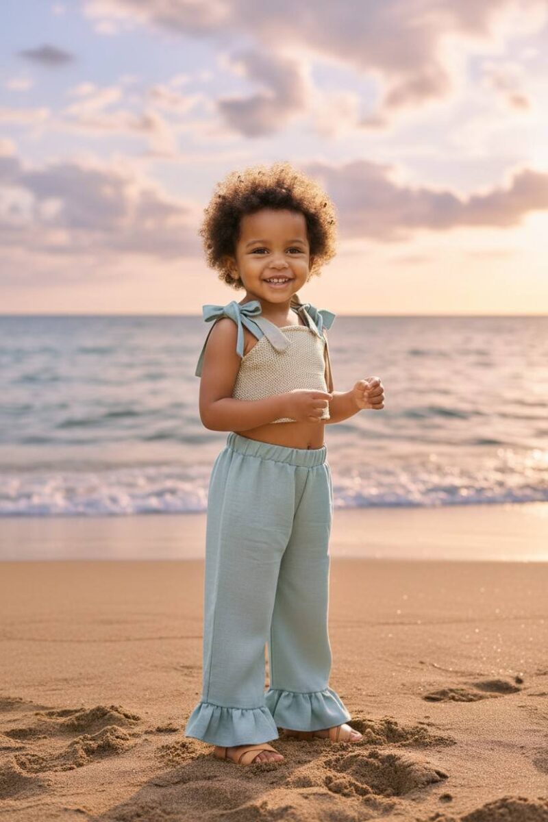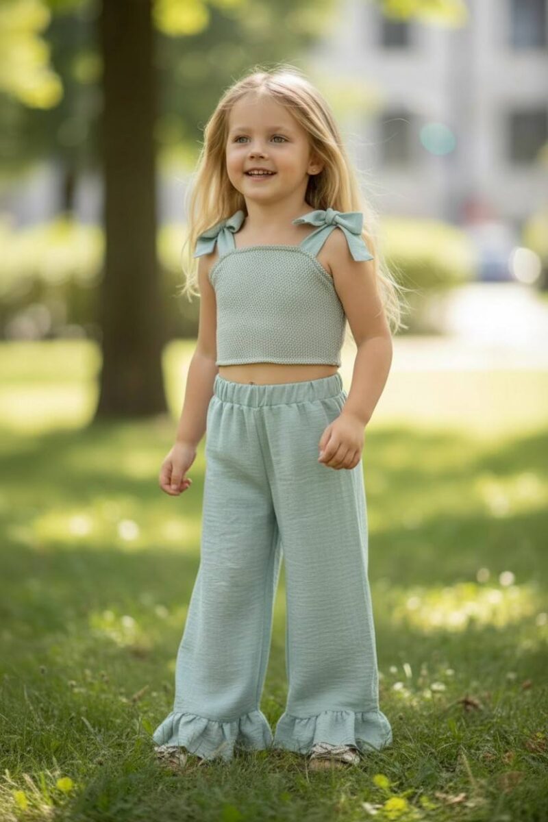 Σετ μέντα χρώμα τοπάκι διπλό μπούστο με φιλέ ύφασμα εμπρός και δέσιμο από πείσω . Παντελόνι με βολάν .Παραγωγή / Κατασκευή Αποκλειστικά στην ΕΛΛΑΔΑ