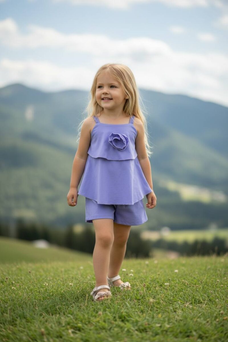 Σετ μωβ χρώμα με αεράτο crop top με λουλούδι και σορτς. 100% βάμβακι. Παραγωγή / Κατασκευή Αποκλειστικά στην ΕΛΛΑΔΑ