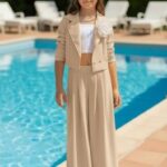 Σετ σατεν τοπ με διακοσμητικά λουλούδια και παντελόνι με λάστιχο και ζωνακι με λουλούδια.