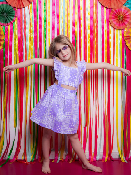 Φόρεμα με χιαστί πλάτη σε σταθερό μωβ ύφασμα τυπωμένο καρό και πουά.