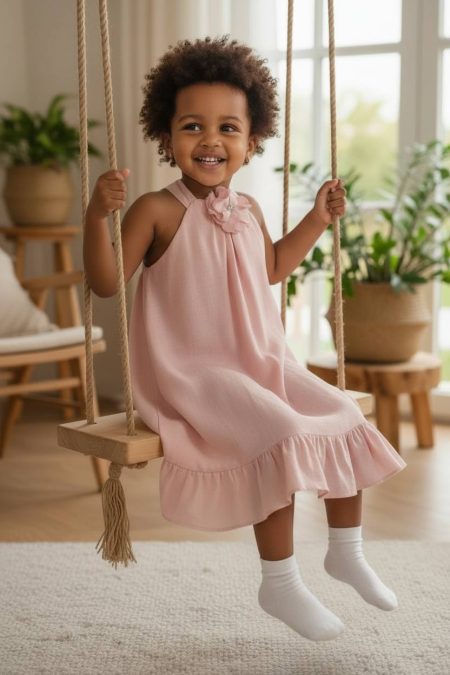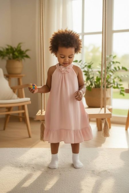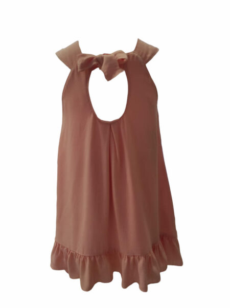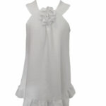 Φόρεμα με λουλούδι- καρφίτσα και βολάν στον ποδόγυρο . Δέσιμο στην πλάτη για μεγαλύτερη ευκολία στην εφαρμογή .Με φόδρα .