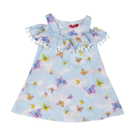 Μπεμπέ φόρεμα εμπριμέ σε σιέλ χρώμα, αμάνικο σε κλος γραμμή με βολάν στο στήθος που αφήνει έξω τους ώμους και pom pom στο τελείωμα του.