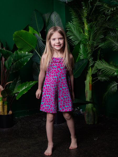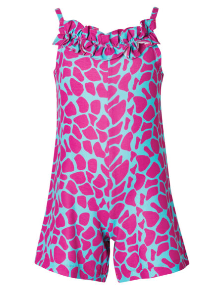 Φανταστική ολόσωμη φόρμα σε σταθερό ύφασμα λέοπαρ φουξ με τυρκουάζ, αμάνικη, άκρως καλοκαιρινή.