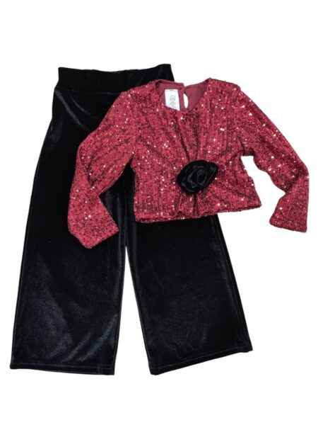 Σετ τοπ με λουλούδι καρφίτσα μπορντό παγιετα με βελούδο παντελόνι καμπάνα
