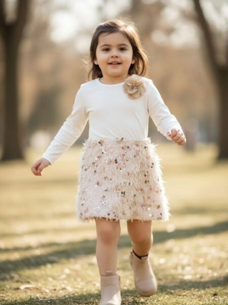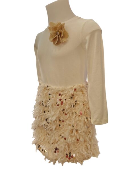 Σετ μπλούζα και φούστα μπεζ-χρυσού με πούπουλα και παγετα.Παραγωγή / σχεδιασμός αποκλειστικά στην ΕΛΛΑΔΑ .