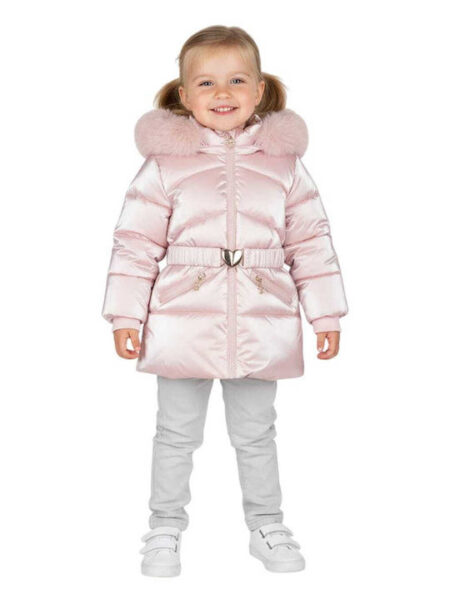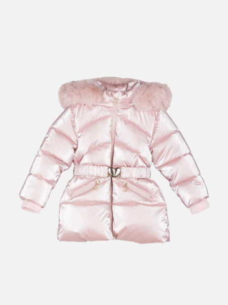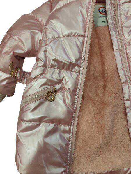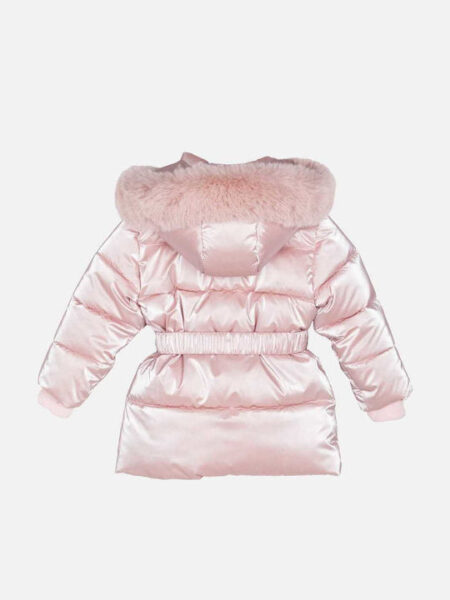 Μπουφάν ροζ μεταλιζέ με ελαστικό ζωνάκι, σε ροζ χρώμα γυαλιστερό, με γούνινη επένδυση απο μέσα, με αποσπώμενη κουκούλα πλαϊνές τσέπες και κλείσιμο με φερμουάρ.