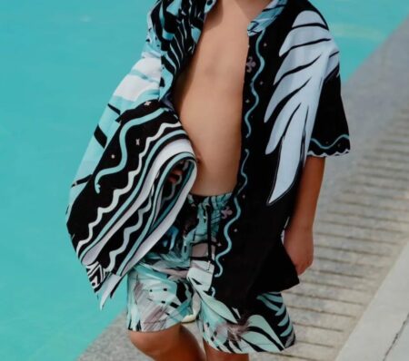 Πετσέτα θαλάσσης 100% βαμβακερή με all-over μαύρο/ώχρα τύπωμα. Συνδυάστε με ίδιο μαγιό και ντύσιμο παραλιας