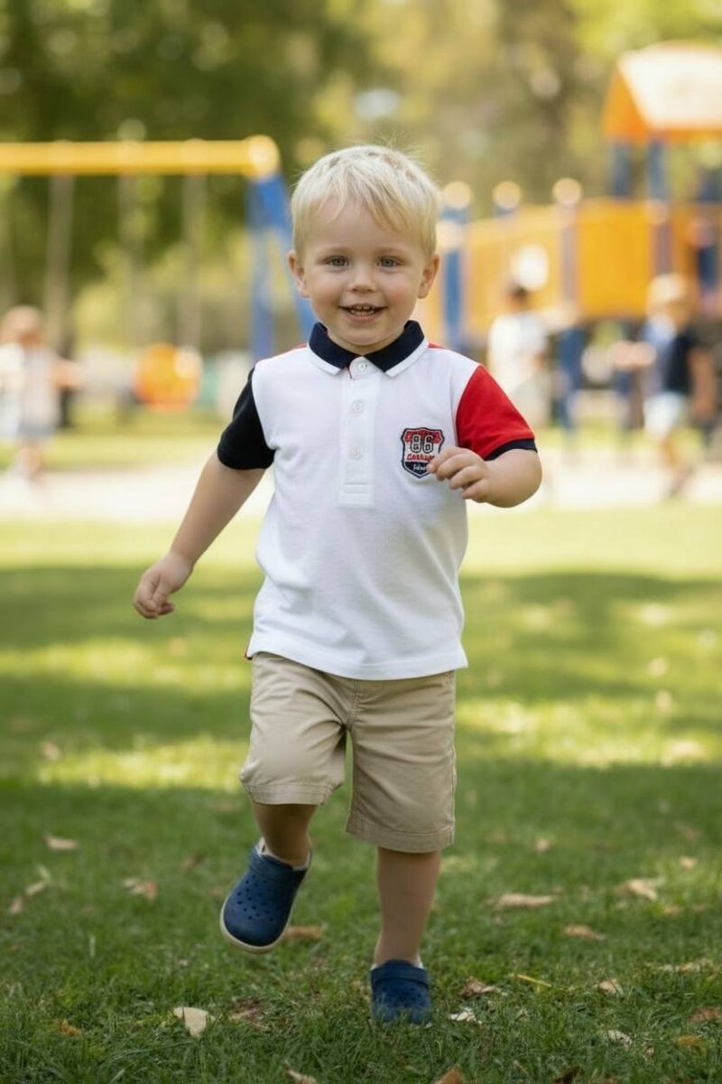 Μπλούζα πόλο, βαμβακερή, ελληνικής κατασκευής, σε λευκό χρώμα με μπλε γιακά και διχρωμα μανίκια σε μπλε και κόκκινο, με τύπωμα