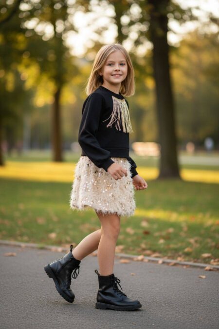 Σετ πλεκτοί μπλούζα με κρόσσια παγετα φούστα μπεζ-χρυσού με πούπουλα και παγετα.Παραγωγή / σχεδιασμός αποκλειστικά στην ΕΛΛΑΔΑ .
