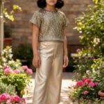 Σετ πλεκτο μπλουζάκι με κοράσια παγετα με χρυσο παντελόνι 3/4 δερματίνη