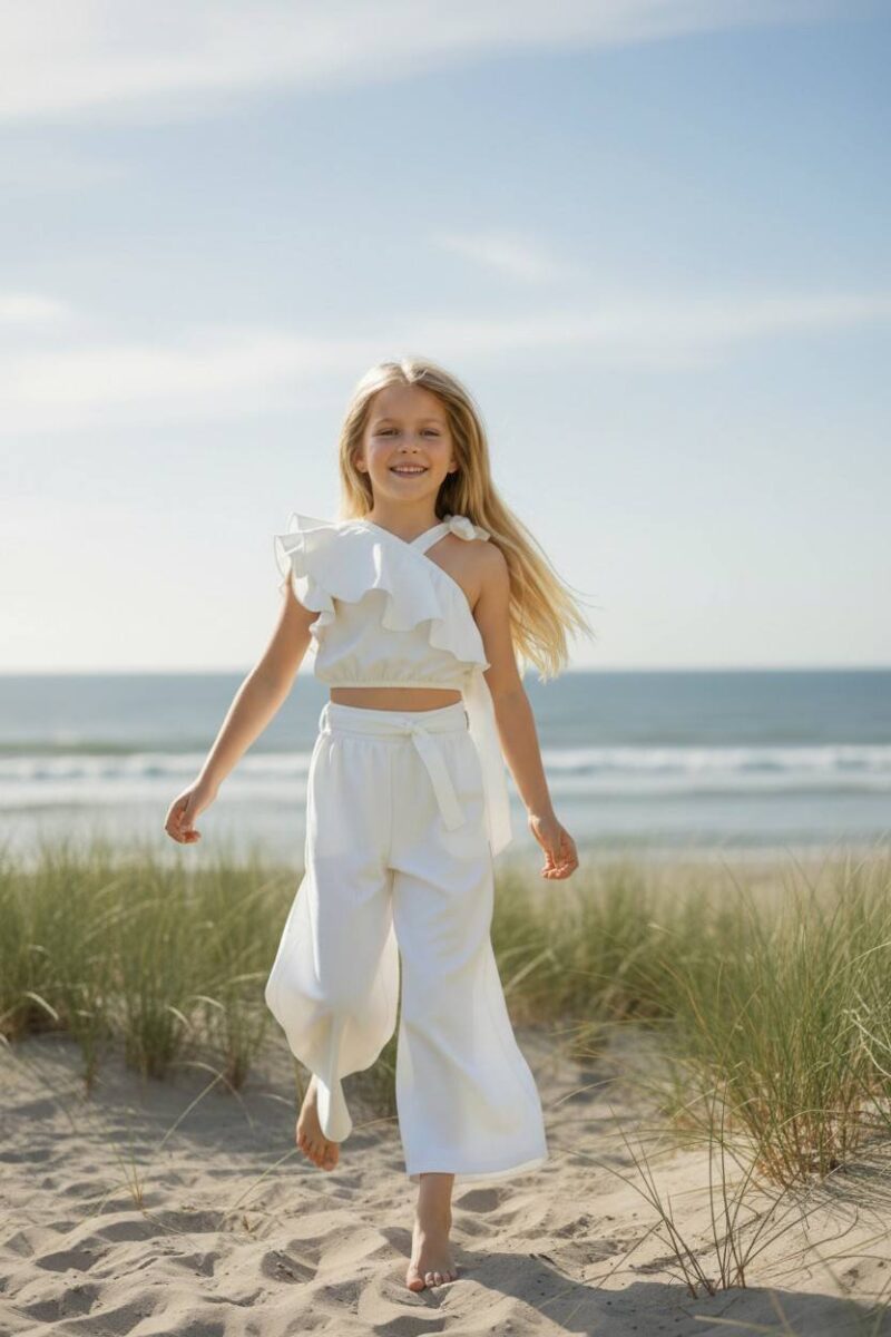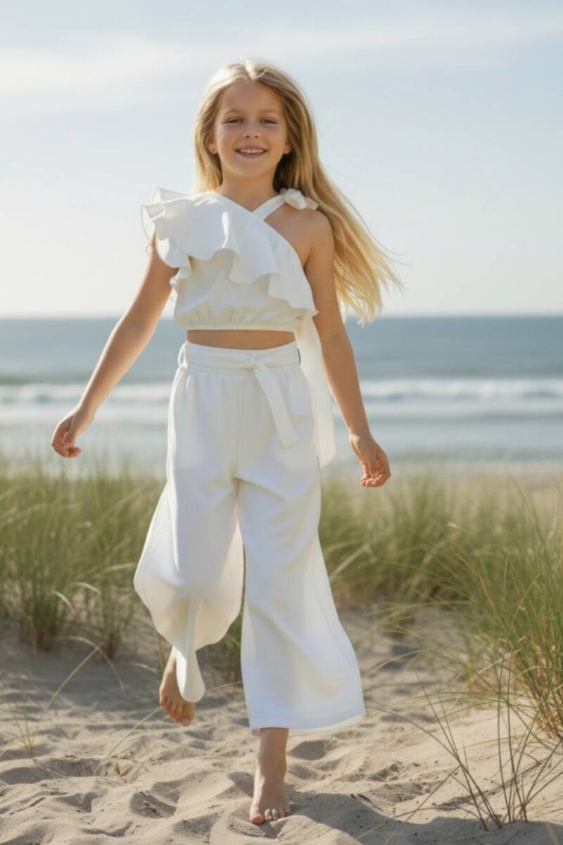 Σετ εκρού χρώμα τοπάκι με βολάν στο μανίκι με δέσιμο και παντελόνι με άνοιγμα. Πωλούνται και ξεχώρισα! Παραγωγή / Κατασκευή Αποκλειστικά στην ΕΛΛΑΔΑ