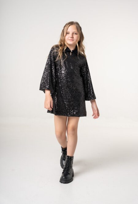Children's dress Ge.ni.us . Μοντέρνο Παιδικό φόρεμα με παγέτα και βελούδινο γιακά . Εσωτερική επένδυση με μαλακή φόδρα και διακοσμητικό κουμπάκι στον λαιμό . Άνετη γραμμή , ιδανικό για γιορτινές εμφανίσεις .