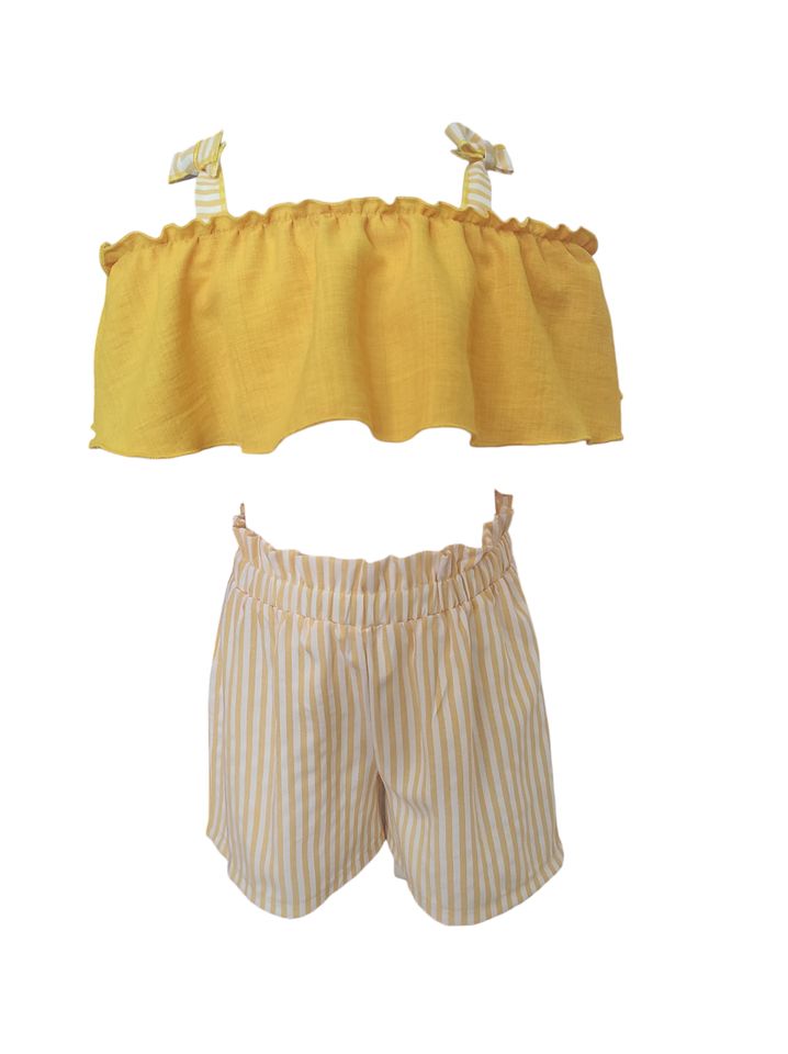 Παιδικό σετ κροπτοπ με βολάν και σορτς ριγέ ύφασμα .Σύνθεση 95% βαμβάκι