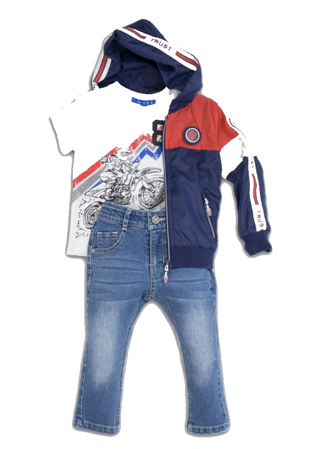 Αποτελείται από αντιανεμικό λεπτό μπουφανάκι με φωτάκια, κοντομάνικη μπλούζα και παντελόνι μαλακό με κουμπάκι στην μέση, τύπου τζιν.