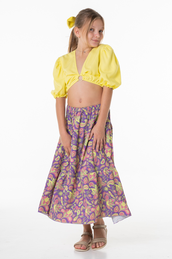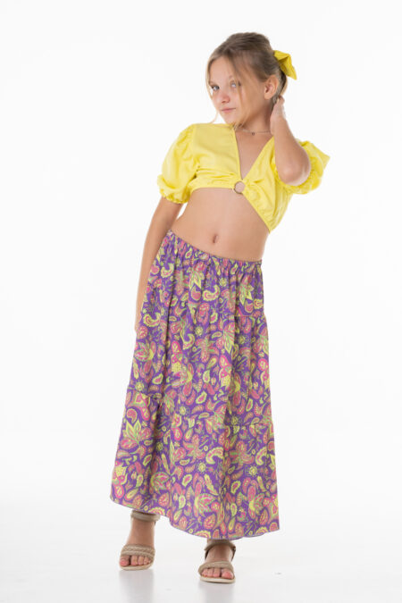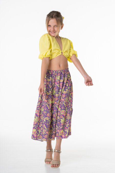 Σετ τοπάκι με μακριά εμπριμέ φουσάτα . Τοπάκι σε κοντή γραμμή με κρίκο . Ύφασμα με μοντέρνο τύπωμα και ελαστικότητα .
