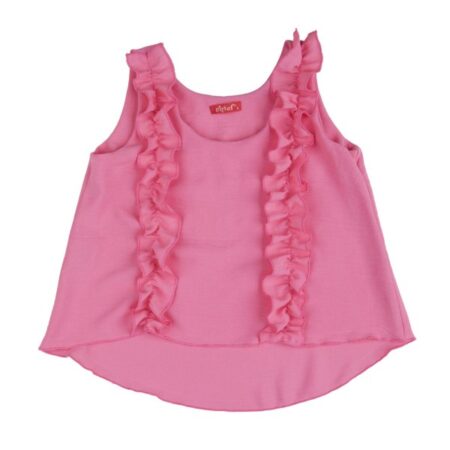 Μπλούζα ροζ ασύμμετρη σε κλος γραμμή με κάθετα βολάν από τον ώμο μέχρι το στρίφωμα. (Αντιγραφή)
