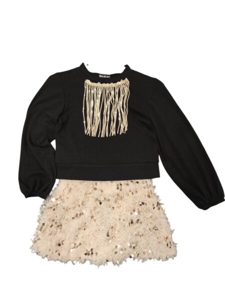 Σετ πλεκτοί μπλούζα με κρόσσια παγετα φούστα μπεζ-χρυσού με πούπουλα και παγετα.Παραγωγή / σχεδιασμός αποκλειστικά στην ΕΛΛΑΔΑ .