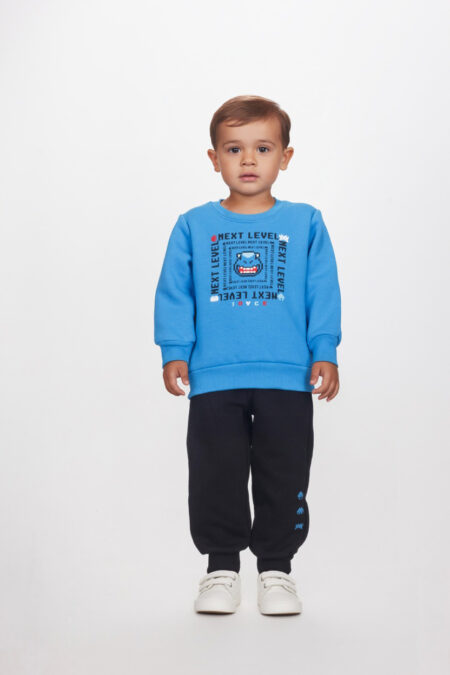 Σετ σε  γαλάζιο  χρώμα, κατασκευασμένο από 80% βαμβάκι και 20% πολυεστέρα. Το υλικό διαθέτει μαλακό χνούδι, προσφέροντας ζεστασιά και άνεση κατά τη διάρκεια των χειμερινών ημερών.