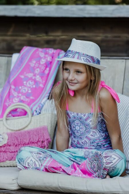 Ολόσωμο μέντα-pink all-over retro τύπωμα με δεσίματα στους ώμους pink. UPF 50+ αντιηλιακή προστασία με αποκλειστικό all-over τύπωμα CL.