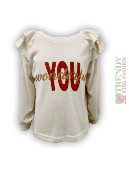 Μπλούζα εκρού πλεκτή άνετη με βολάν και φάσες στα μανίκια και τύπωμα εμπρός you wonderful σε γήινες αποχρώσεις.